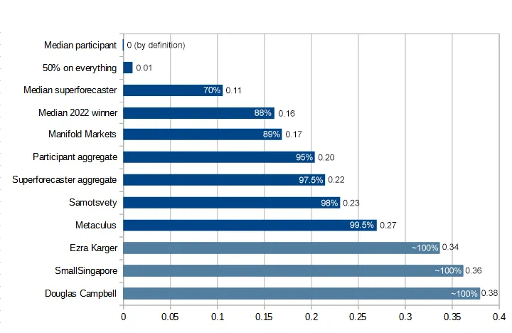 Metaculus has grown formidable, with their proprietary aggregate performing at the 99.5th percentile.