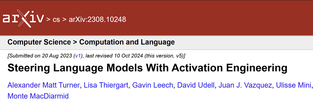 We investigate activation engineering: modifying the activations of a language model at inference time to predictably alter its behavior. It works by adding a bias to the forward pass, a ‘steering vector’ implicitly specified through normal prompts. Activation Addition computes these vectors by taking the activation differences of pairs of prompts.